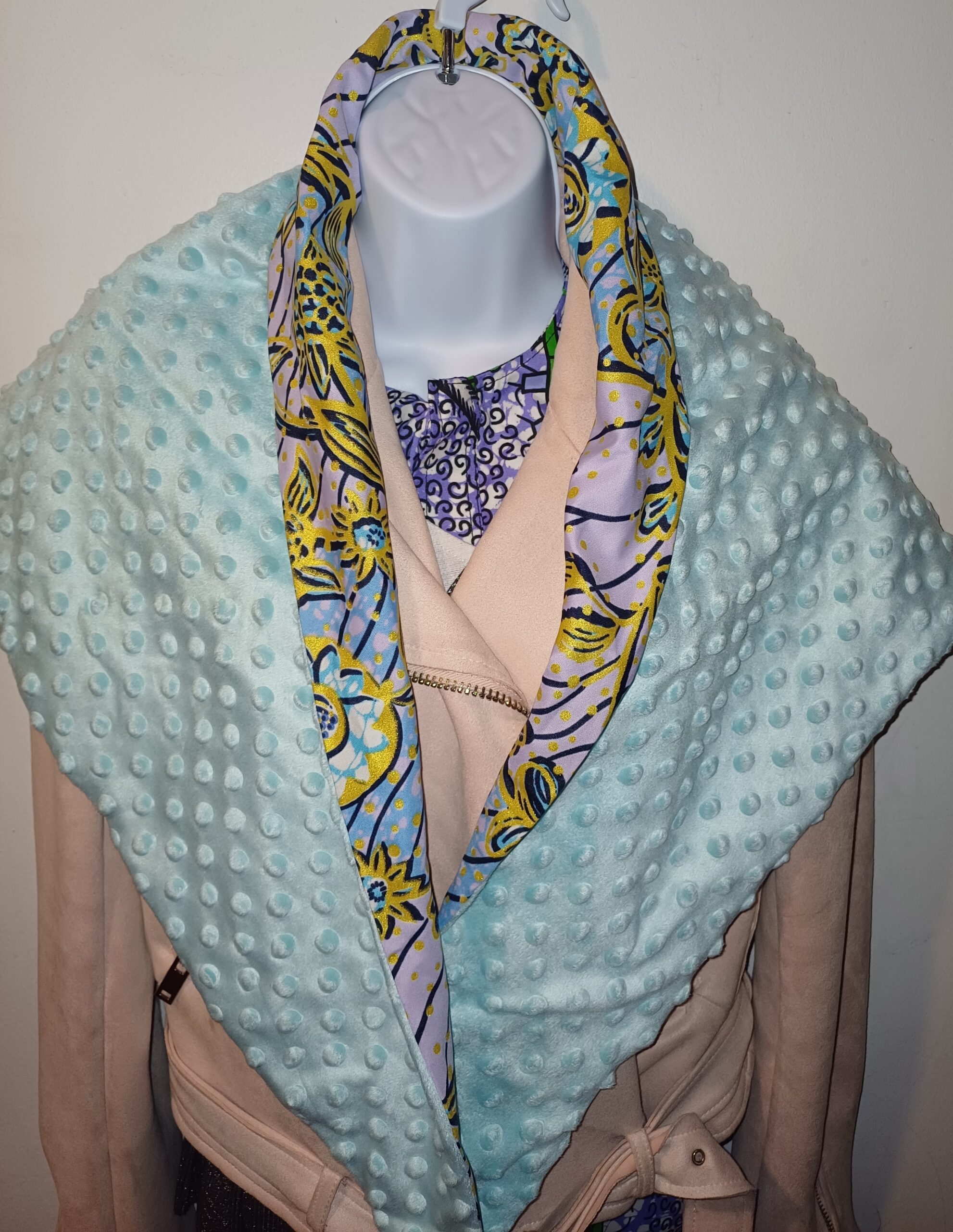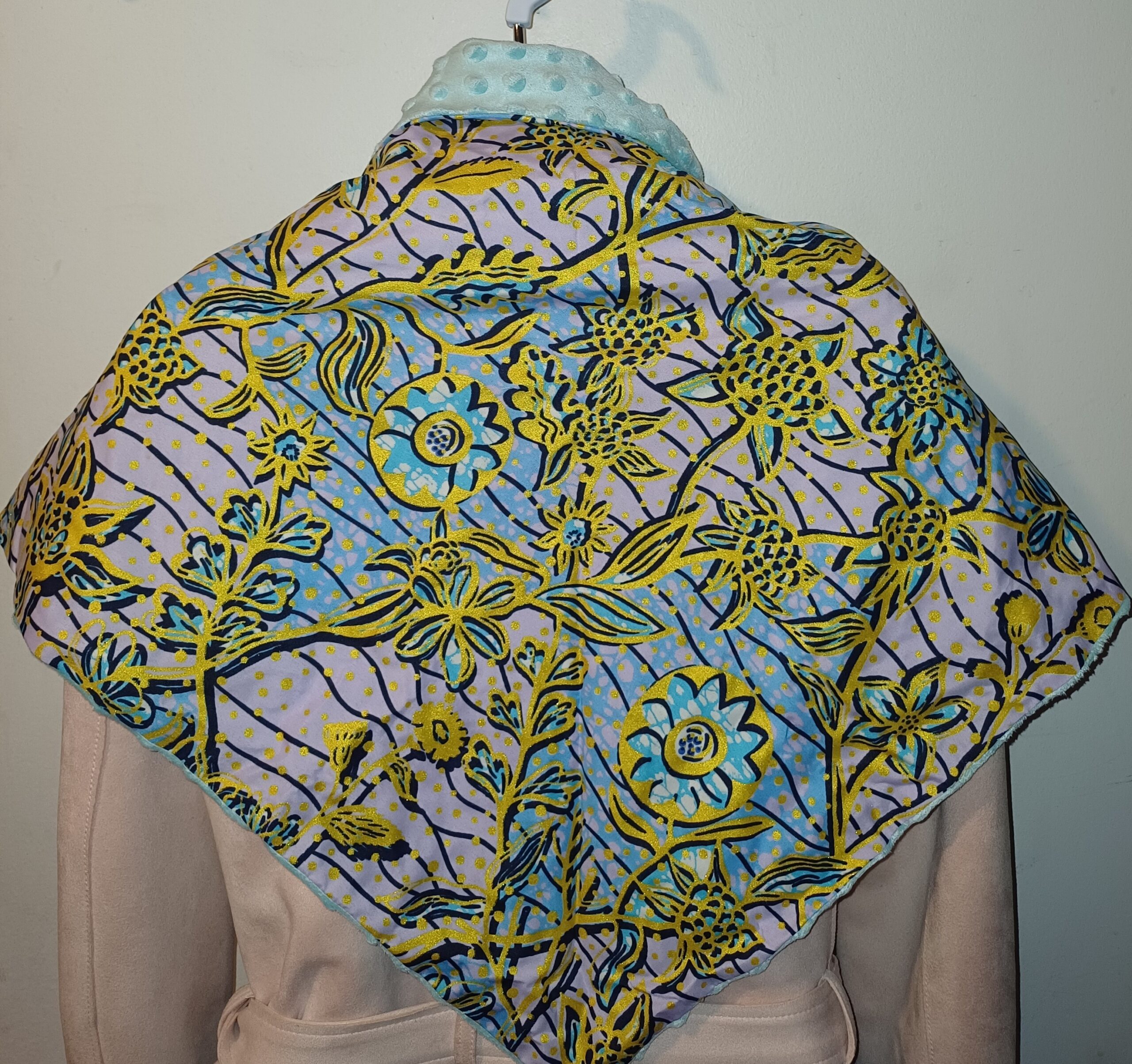 châle à double face wax-minky. Le minky est un tissu très doux et chaud, idéal pour les saison froides. La doublure en coton ajoute une touche de confort et de protection contre le froid.