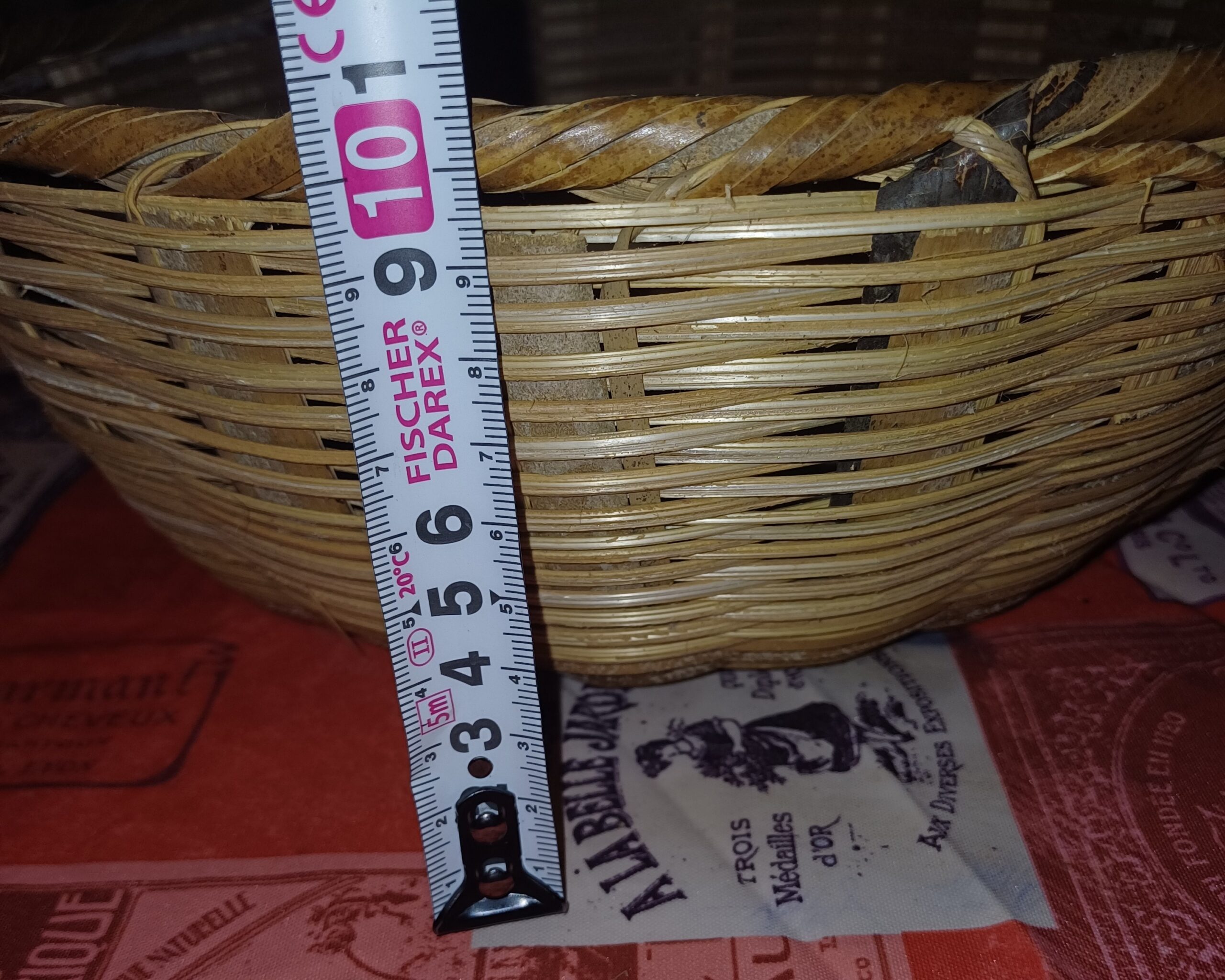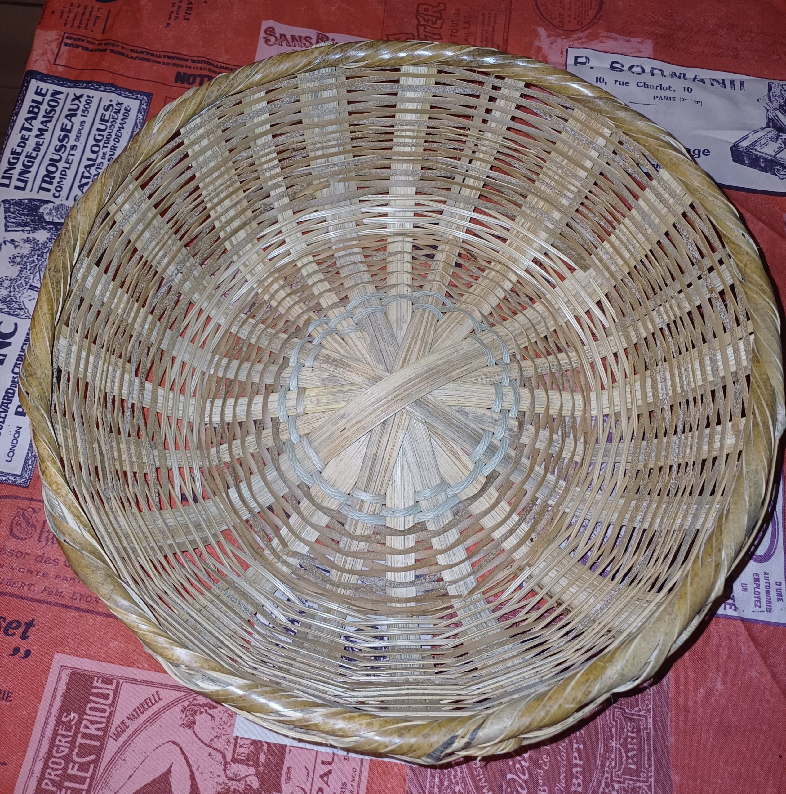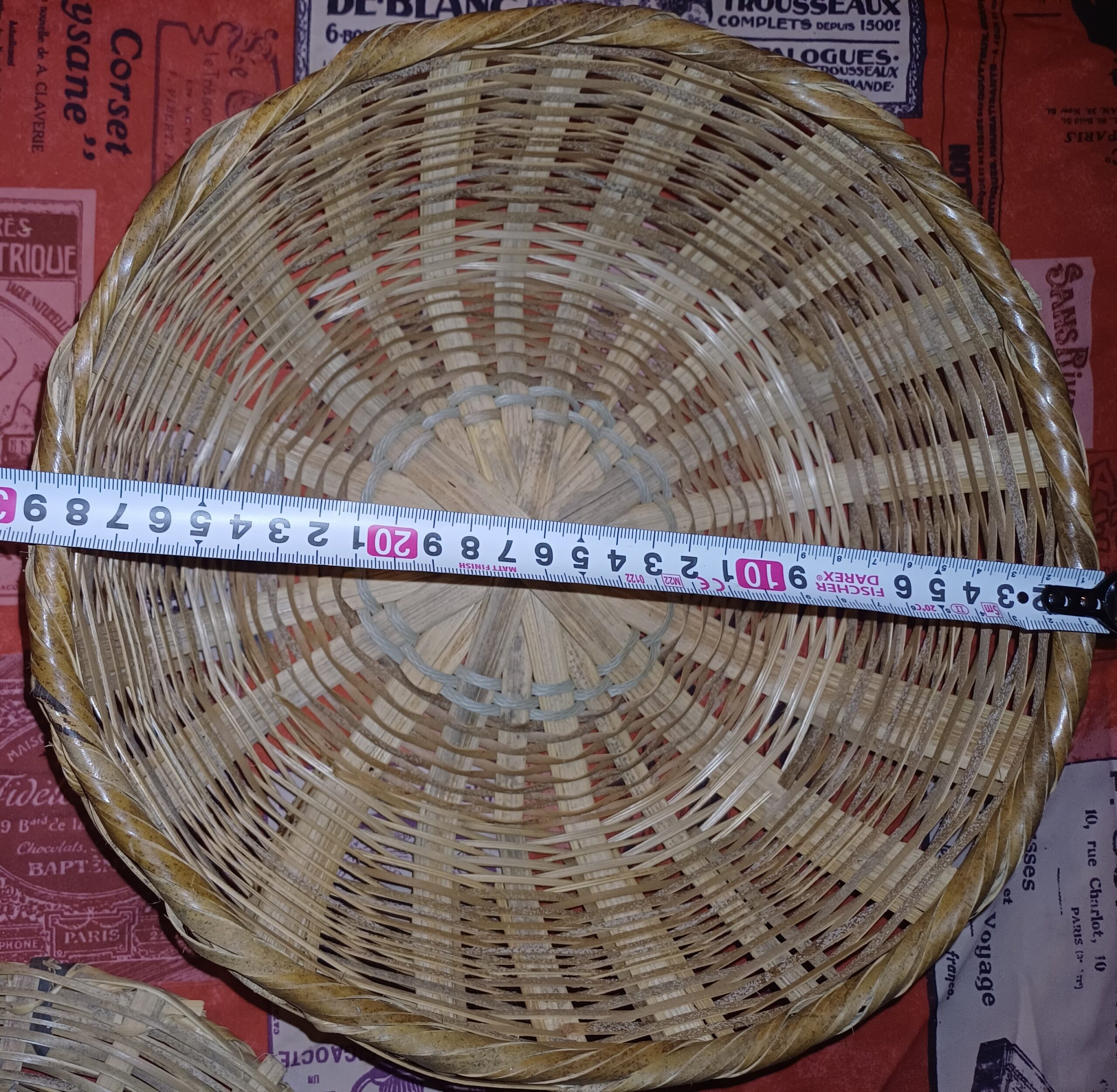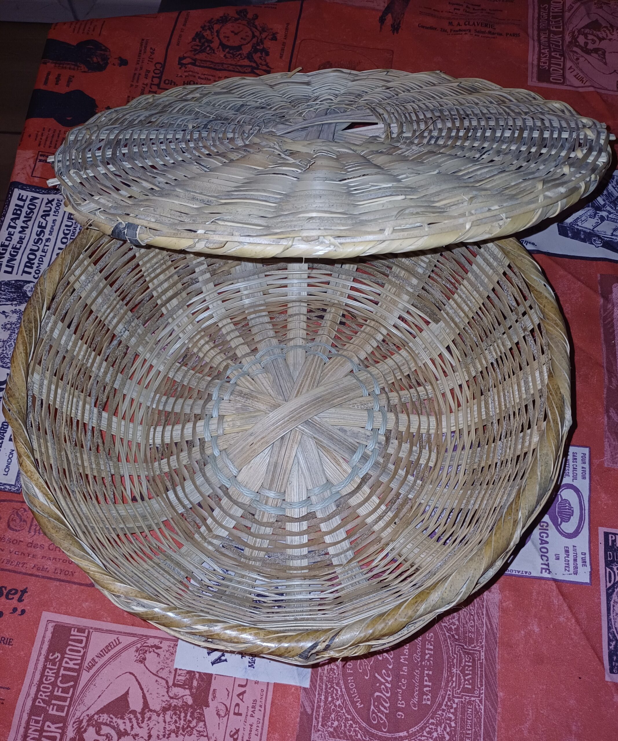 Tressé à la main la corbeille et son couvercle conserveront vos fruits et légumes à l’abri des guêpes et autres insectes. Diamètre haut 29cm ; diamètre fond 18 cm, hauteur sans couvercle 10 cm.